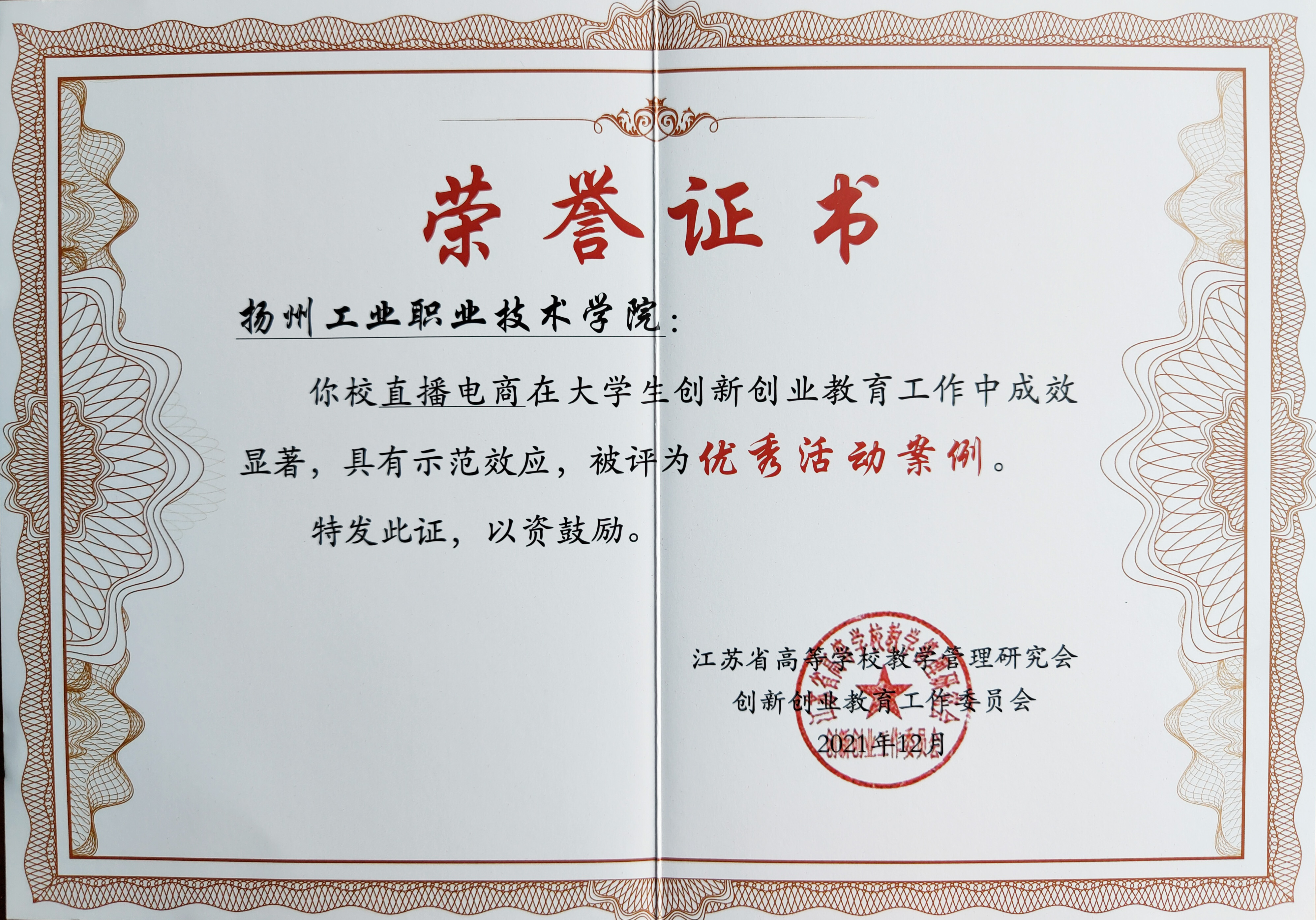 会上,我校被推选为创新创业工作委员会常务理事单位。此外,我校“三全三融”的高职双创教育模式被评为省级创新创业实践教育中心优秀平台运行模式(全省仅6所高校),直播电商被评为省级创新创业实践教育中心优秀活动案例(全省仅8个),颜正英被评为2021年优秀创新创业教育管理工作者,王盛被评为2021年省级创新创业实践教育中心优秀创新创业导师。